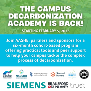The session will also introduce participants to the 2026 Campus Decarbonization Academy, a comprehensive six-month, cohort-based program designed to empower higher education institutions in advancing their decarbonization efforts. Developed by AASHE in partnership with NACUBO – National Association of College and University Business OfficersSCUP – Society for College and University PlanningSecond NatureSustainable Endowments Institute and U.S. Green Building Council. The Academy equips sustainability, energy, lab, facilities, finance, and planning professionals with the skills and knowledge needed to lead effective campus decarbonization initiatives. Participants gain actionable guidance on renewable energy adoption, electrification, stakeholder engagement, and accessing funding sources and state resources, ensuring they are well-prepared to overcome key challenges and drive impactful change.